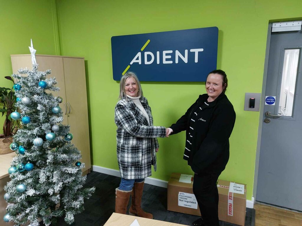 Community Development Manager Anita Middleton pictured thanking Lydia Sammons of Adient Seating Burton on Trent, after receiving £159 funding to purchase replacement defibrillator pads, following the Church defibrillator being used to save someones life, 2 weeks after its installation.